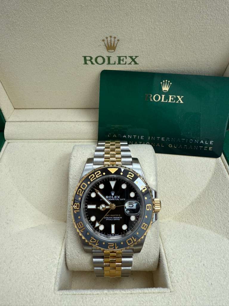 The Rolex GMT Master II Two Tone 18K YEAR 2025 40mm (model 126713GRNR) is a sophisticated timepiece that combines stainless steel with 18K yellow gold for a refined two-tone look. Featuring the iconic green and black ceramic bezel, it allows tracking of two time zones simultaneously, making it perfect for global travelers. This model comes complete with its original box and papers, ensuring authenticity and added value. Its automatic movement, robust Oyster case, and comfortable bracelet exemplify Rolex’s blend of durability and luxury.