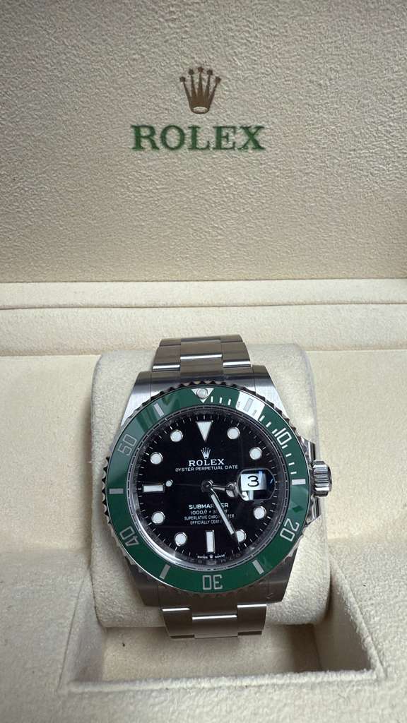 The ROLEX SUBMARINER 126610LV with box and papers offers an authentic and complete ownership experience. This professional dive watch features a corrosion-resistant Oystersteel case, a distinctive green Cerachrom bezel, and is powered by the precise Caliber 3235 movement with a 70-hour power reserve. Designed to withstand depths of up to 300 meters, it combines robust functionality with elegant design. Including the original box and documentation ensures verified provenance and adds significant value for collectors and enthusiasts.