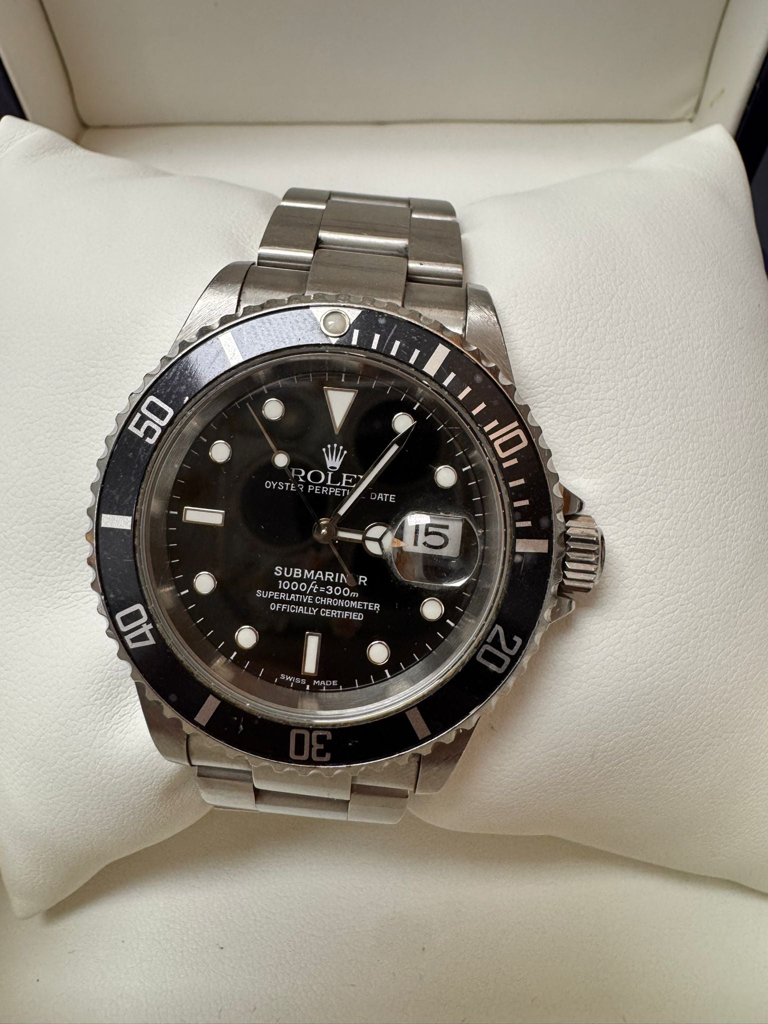 The Rolex Submariner Black-Face (16610) is a quintessential dive watch, known for its robust stainless steel case and iconic black dial and bezel. With water resistance up to 300 meters, it combines professional-grade functionality with timeless design. Powered by a reliable automatic movement, this model delivers precise timekeeping and exceptional durability, making it a favored choice for both divers and collectors seeking classic Rolex performance and style.