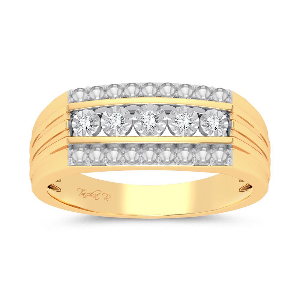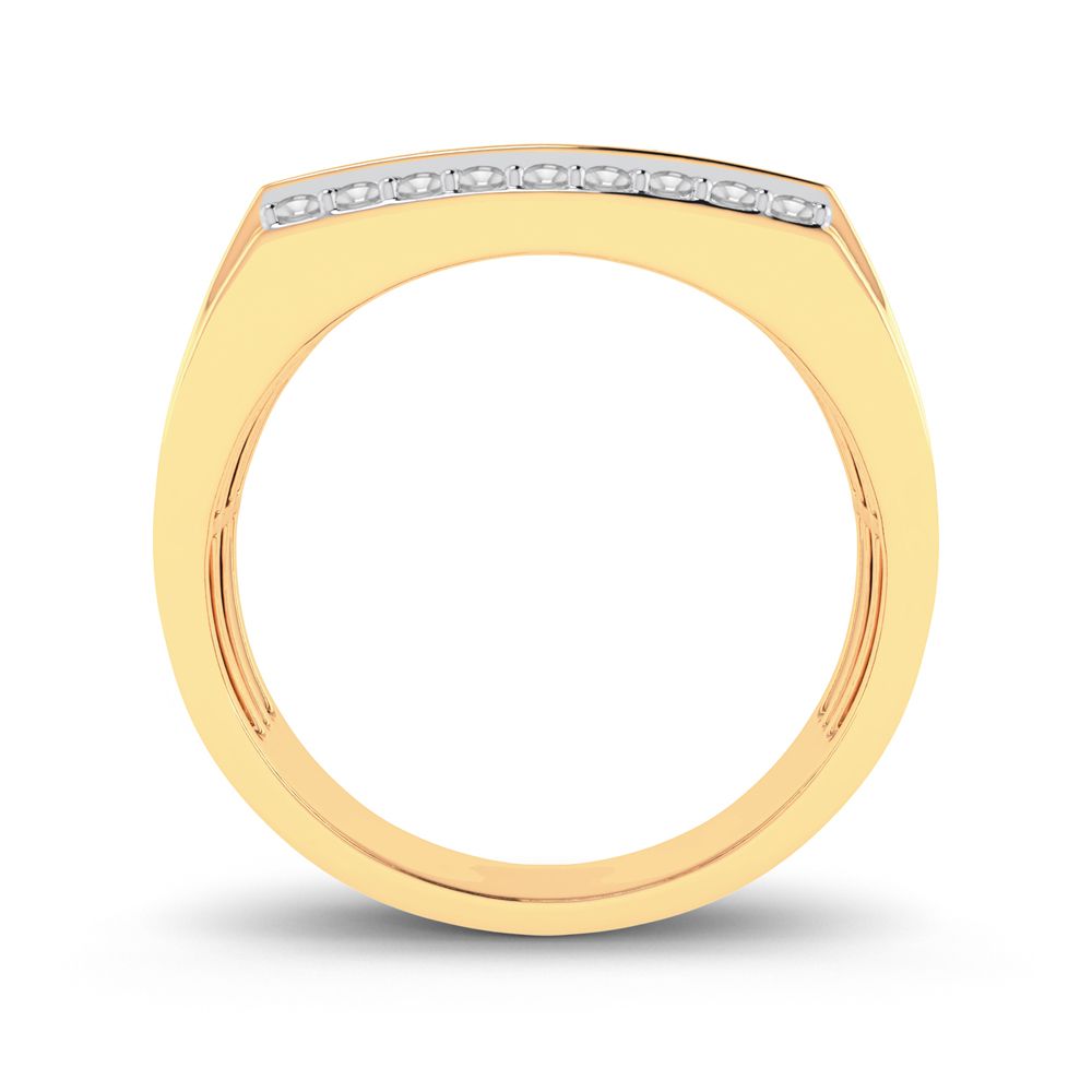 This distinctive 10K Yellow Gold Men's Ring features a dual band design, inlaid with a row of H-I color, I1-I2 clarity diamonds that weigh a total of 0.15 carats. The ring's unique band style radiates a bold and innovative appeal, ideal for the man who appreciates the blend of tradition and contemporary design.