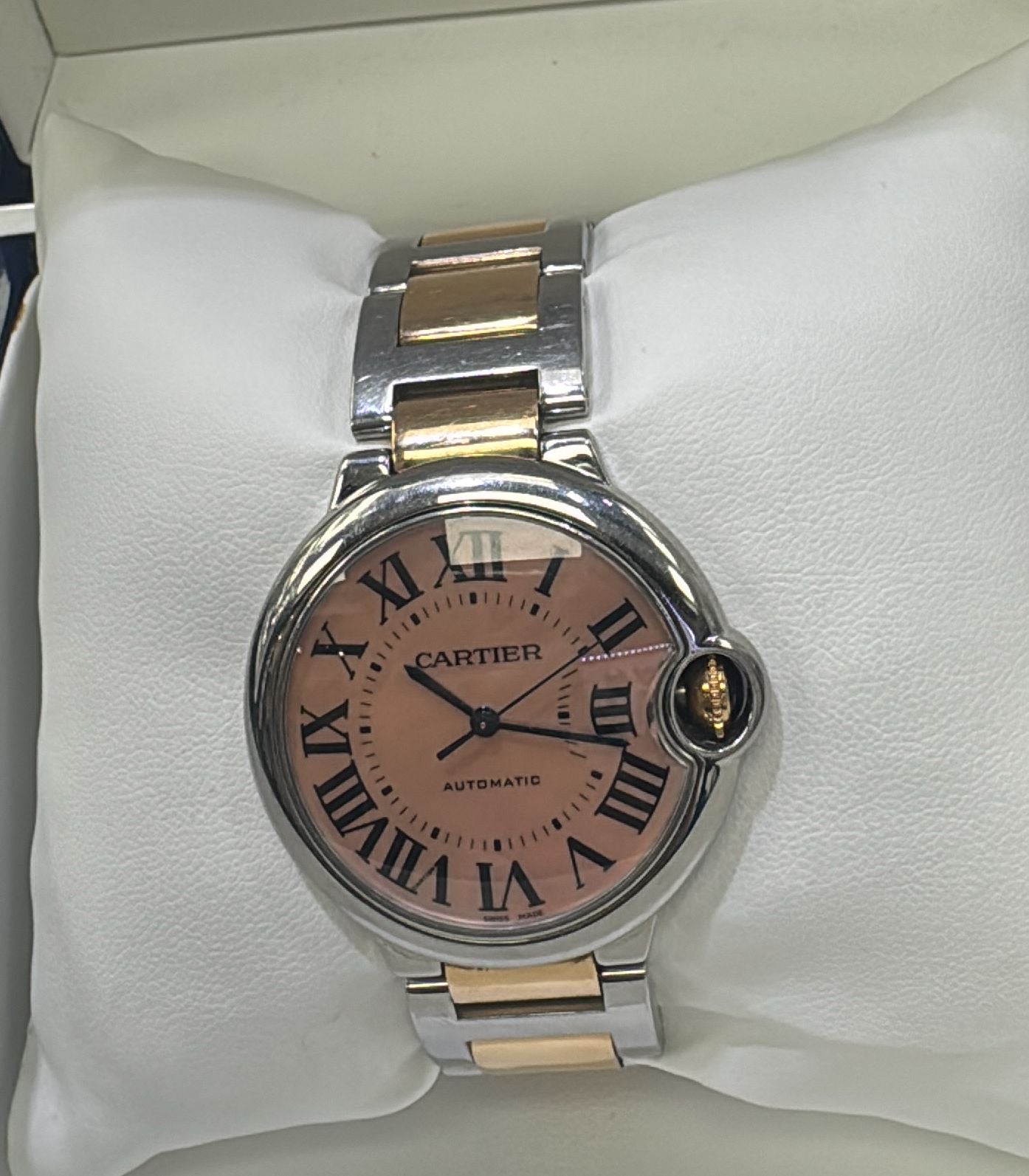 The Cartier Ballon Bleu Two-Tone (model 196852qx) seamlessly blends stainless steel and 18k gold, showcasing Cartier’s signature rounded case and distinctive blue cabochon crown. This exquisite timepiece offers both luxurious style and precise Swiss craftsmanship, making it an ideal choice for collectors and connoisseurs seeking elegance and reliability in one refined wristwatch.