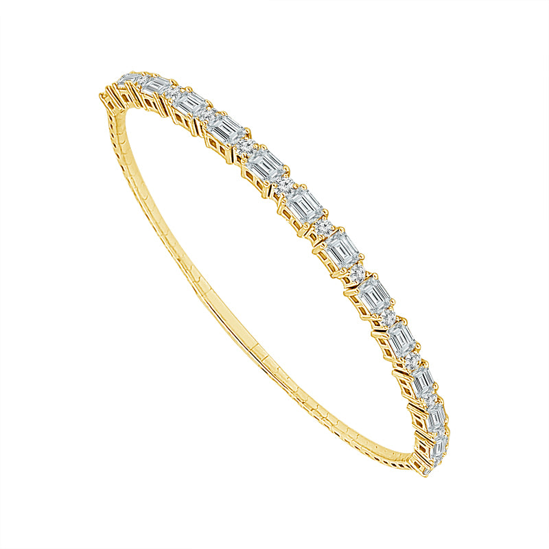 This bangle is a blend of classic allure and modern design. Crafted in your choice of 14k yellow, white, or rose gold, this piece is adorned with 27 exquisite stones in a unique combination of emerald-cut and round shapes. The GH color and SI clarity stones weigh a total of 3.65 carats, providing a radiant sparkle that's sure to captivate.