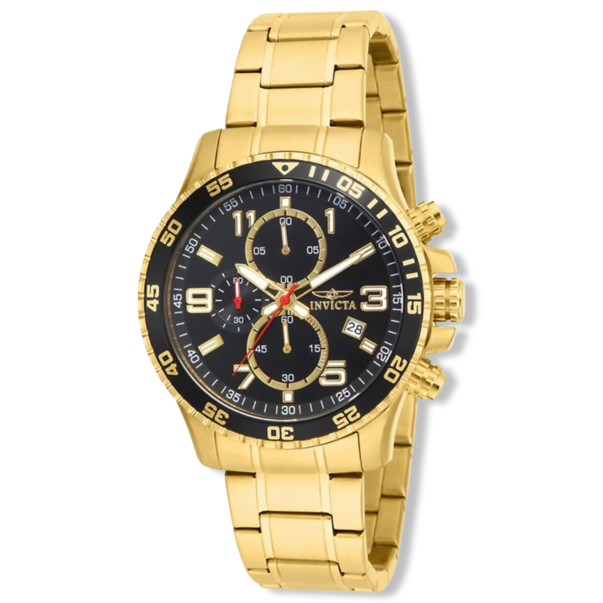 Invicta men's specialty watch, all gold-tone with black dial with luminescent hands. The perfect watch for every day wear.
