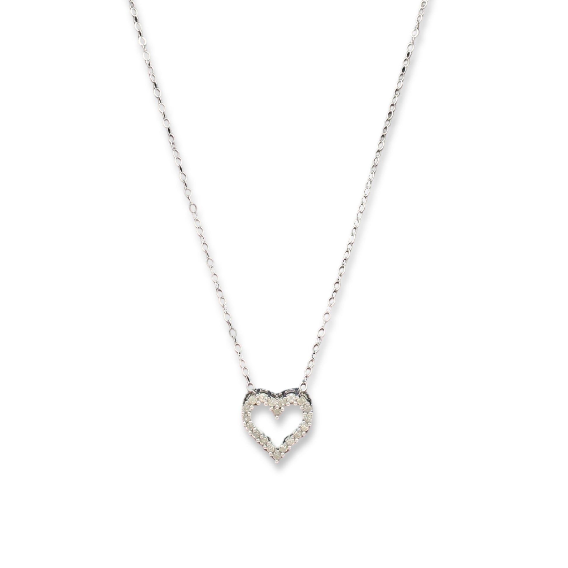 "Eternal Sparkle" is the epitome of sophistication, a 14K white gold necklace that combines the classic elegance of a rolo link chain with the brilliance of a diamond-encrusted heart charm. It's designed to be light around your neck, weighing only 1.6 grams, and has a length of 17 inches, ensuring it sits perfectly for any attire.