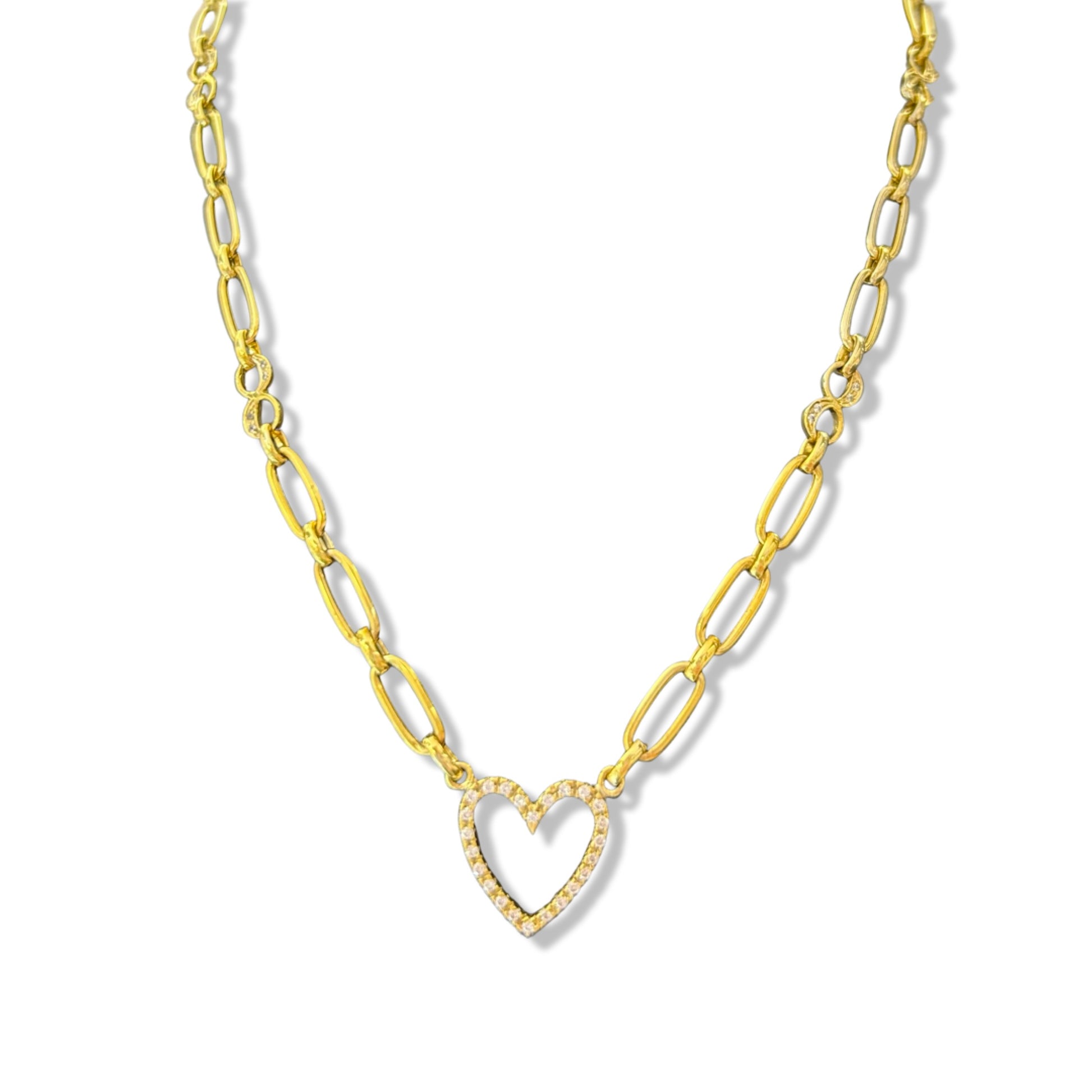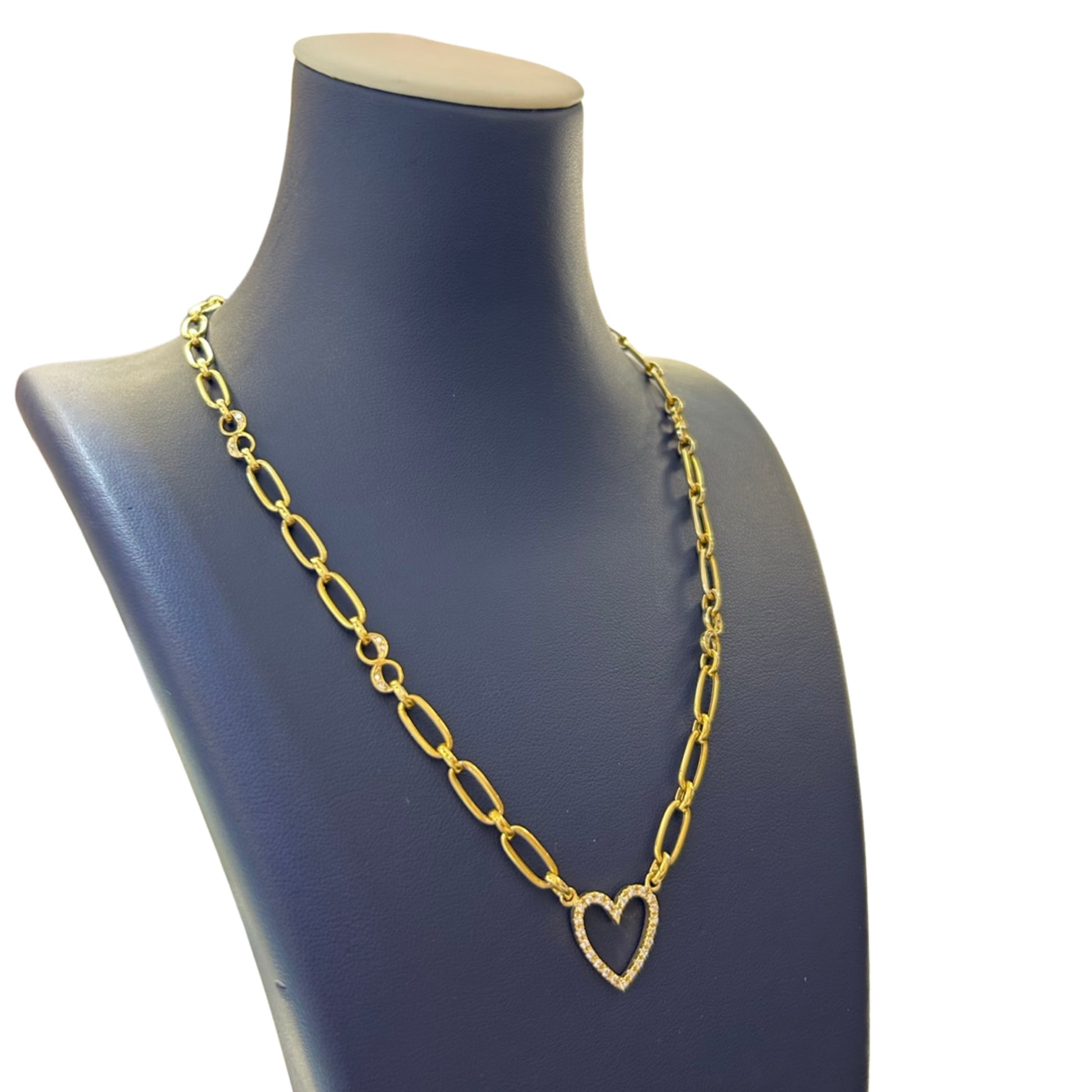 Introducing "Infinite Grace," a chic and contemporary paperclip-style necklace in 14K yellow gold, adorned with a charming heart enhanced by glittering cubic zirconia stones. Weighing 10.4 grams and measuring 17 inches in length, this necklace embodies both modern flair and timeless elegance, making it a versatile addition to any collection.